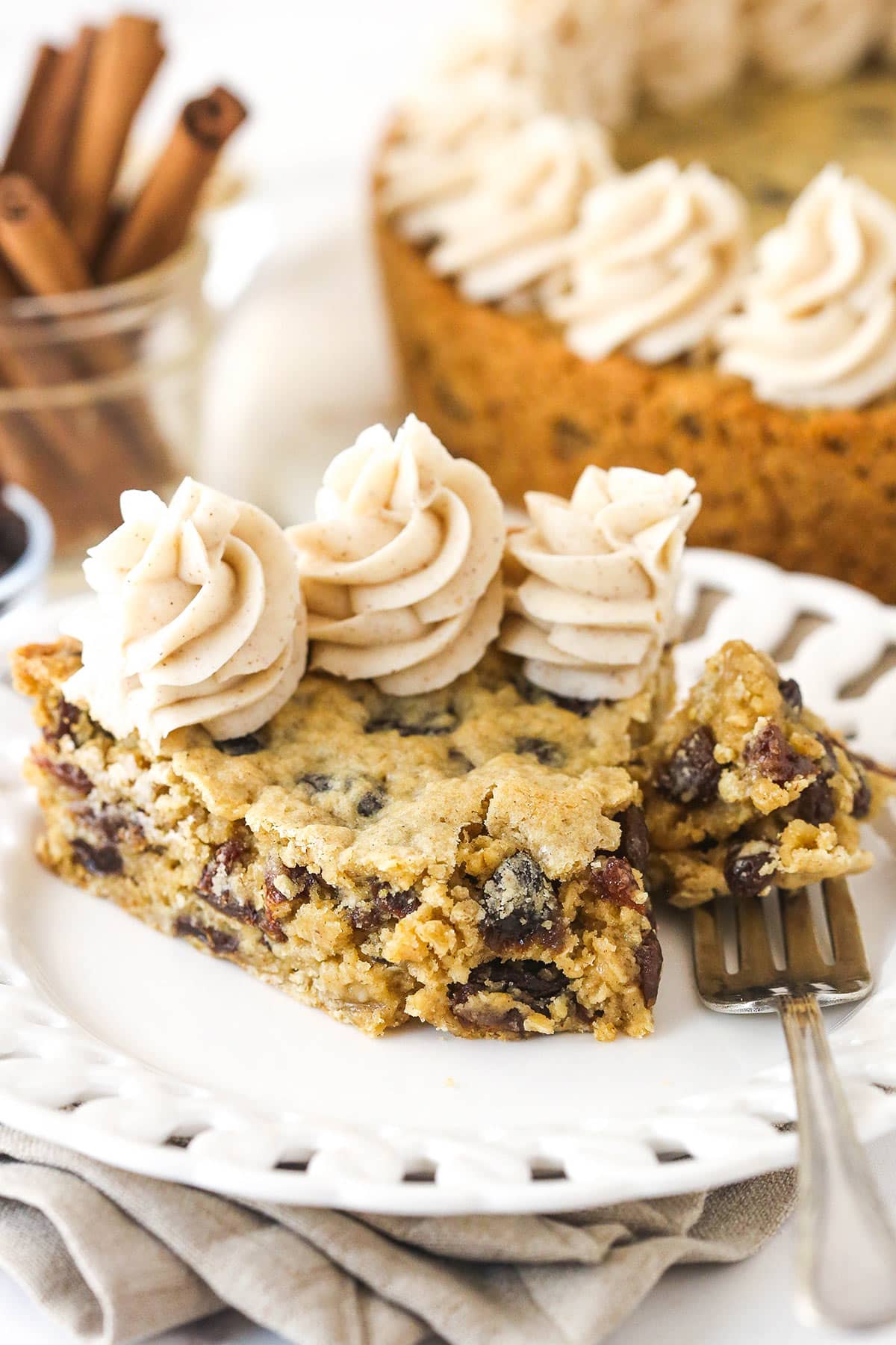 This delightful oatmeal raisin cookie cake is soft, chewy, and loaded with cinnamon and sweet raisins, topped with luscious maple-cinnamon buttercream.