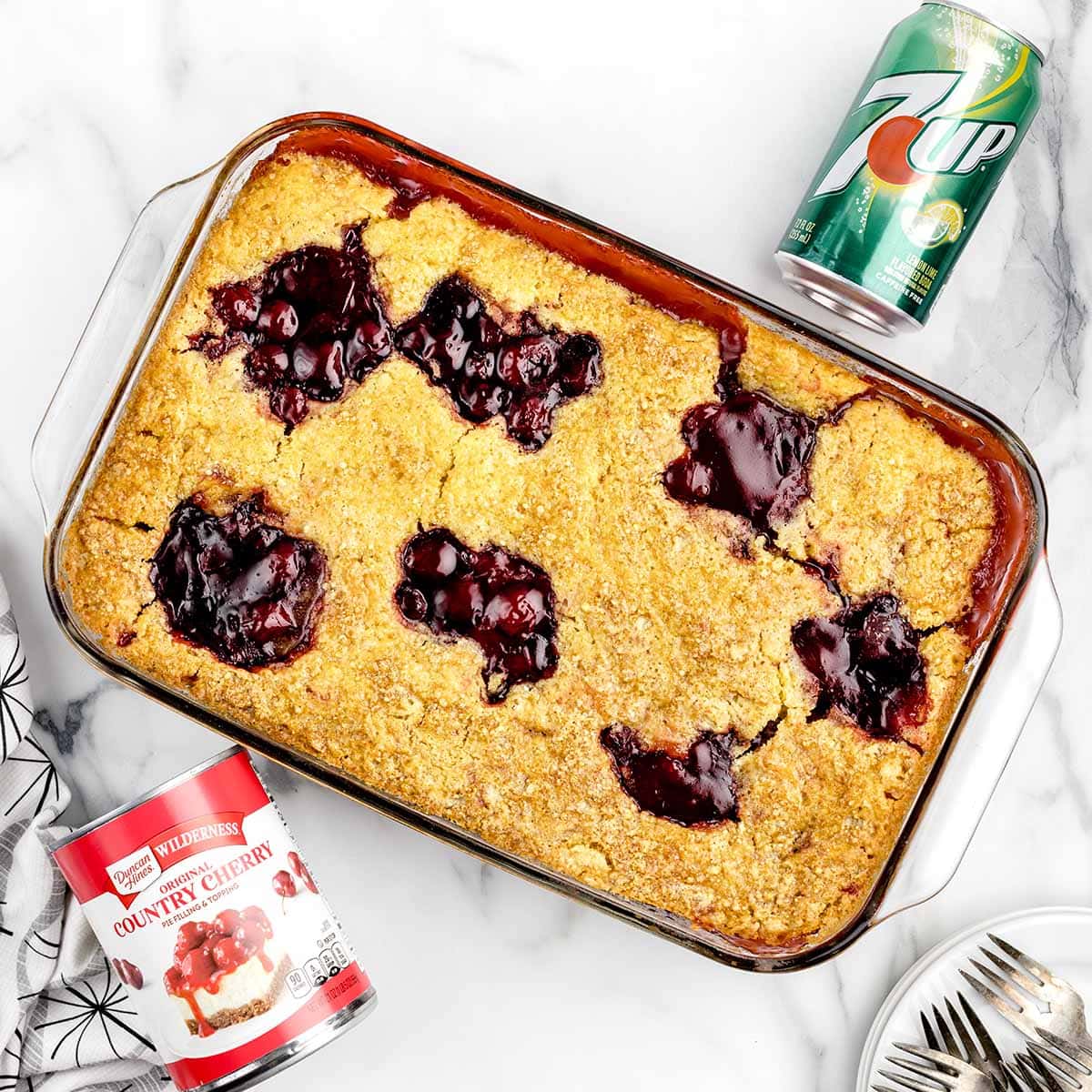 - Sprinkle the dry yellow cake mix evenly over the cherry pie filling.