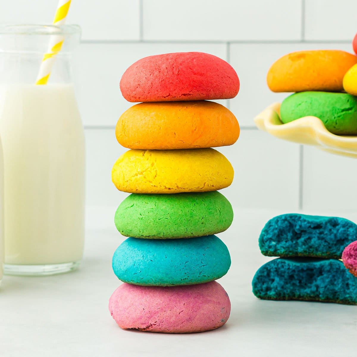 - Separate cookie batter equally into 6 small bowls. Color one bowl red, one orange, one yellow, one green, one blue and one purple.