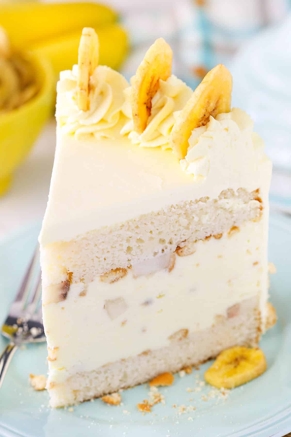 - To finish off the cake, press crushed vanilla wafer crumbs onto the sides of the cake and top it with banana chips, if desired.