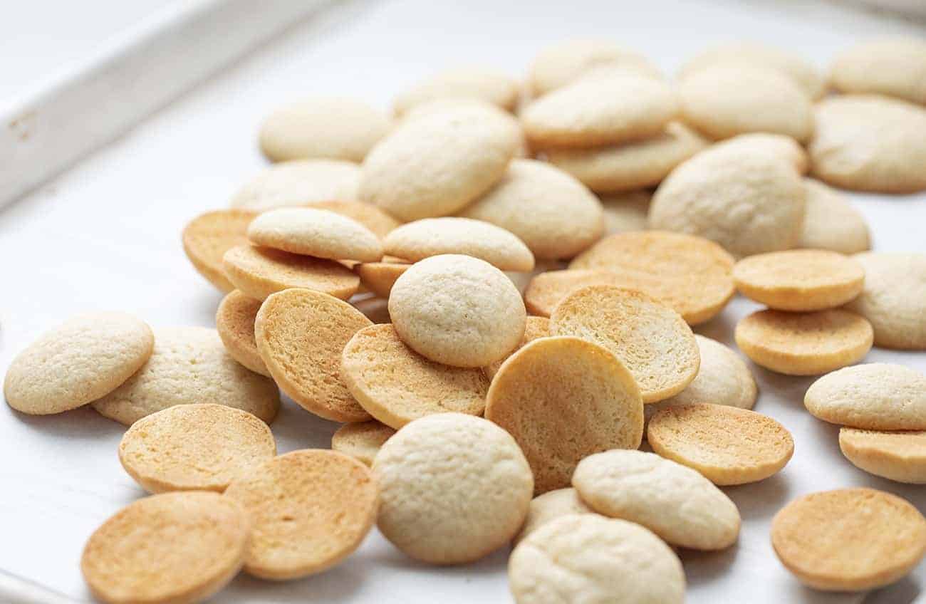 - Scoop 0.5 teaspoon-sized dollops of the batter (about 1 inch apart) onto a baking sheet lined with parchment.