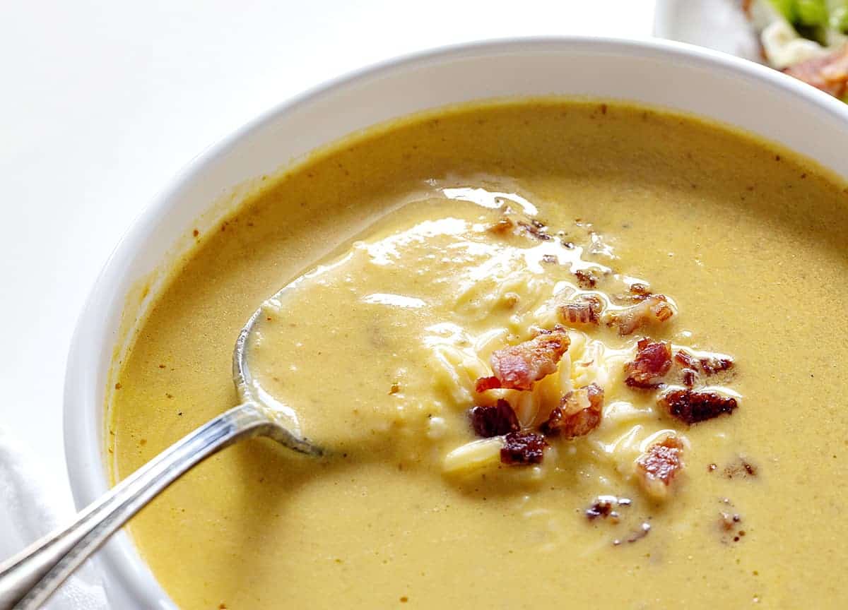 - Use an immersion blender to process the soup until smooth. Stir in the heavy whipping cream and heat through. Add the shredded Gouda and Mozzarella cheeses, stirring until melted.