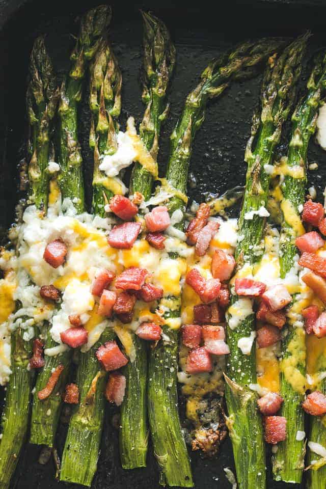 This recipe features tender roasted asparagus topped with crispy bacon and three kinds of melty cheese, including salty feta. It's a flavorful and quick side dish perfect for any meal.