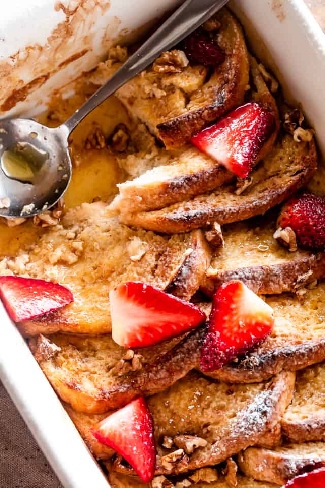- Remove from oven, sprinkle with powdered sugar, garnish with strawberries and nuts if desired, and serve with maple syrup.
