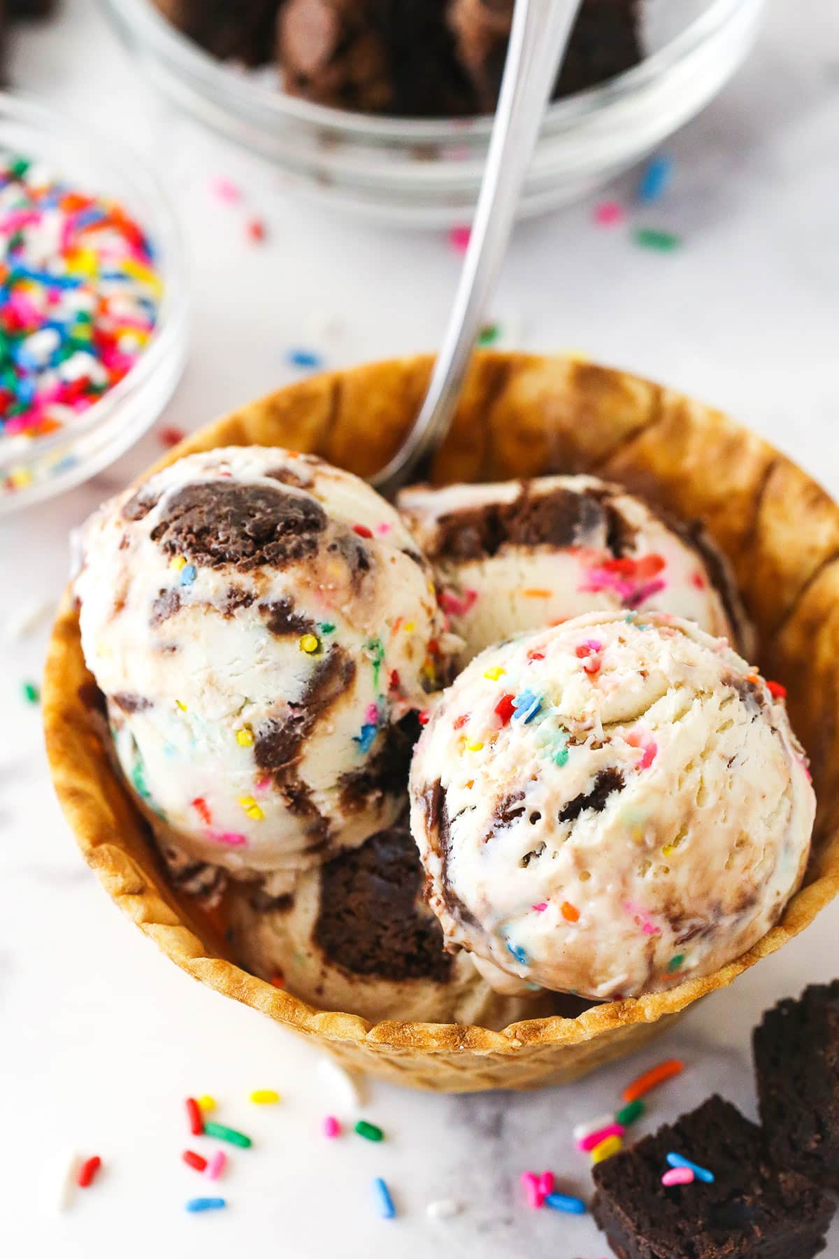 - Layer the ice cream mixture into the prepared loaf pan. Add about one-third of the ice cream mixture to the bottom, then drizzle about one-third of the chocolate fudge over it. Use a knife to gently swirl the fudge into the ice cream. Repeat this layering process two more times, for a total of three layers of ice cream and fudge. Sprinkle a few extra sprinkles on top if desired. Freeze for 4-6 hours, or preferably overnight, until firm. Scoop and serve.