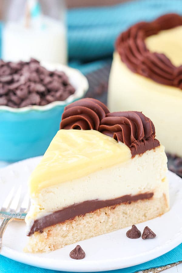 - Make chocolate ganache: heat heavy cream, pour over chocolate chips, add corn syrup and vanilla, whisk until smooth. Cool. Pipe ganache around cheesecake, then spread pastry cream on top. Refrigerate before serving.