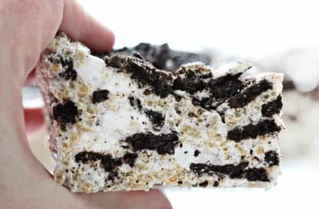 - Gently fold in the Rice Krispy cereal, crumbled Oreo cookies (reserving about 1 cup for topping), and mini marshmallows by hand until everything is well coated.