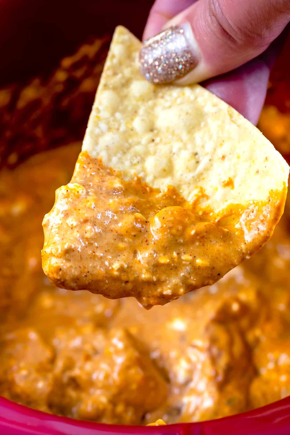 - Place the chili in the bottom of a small crockpot (2-quart size). Add the cream cheese on top.