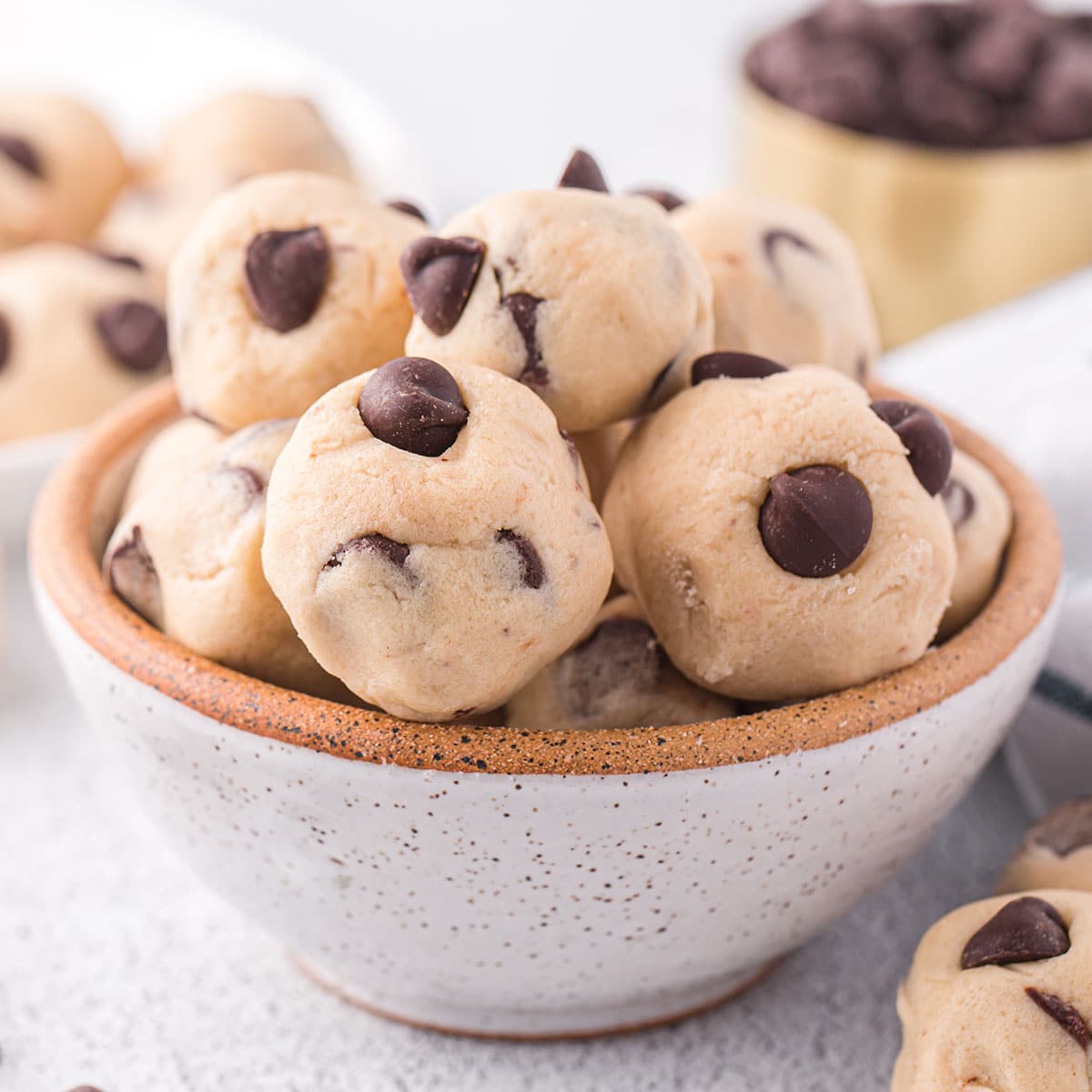 Delicious no-bake cookie dough bites with rich chocolate chips, perfect for snacking or dessert.
