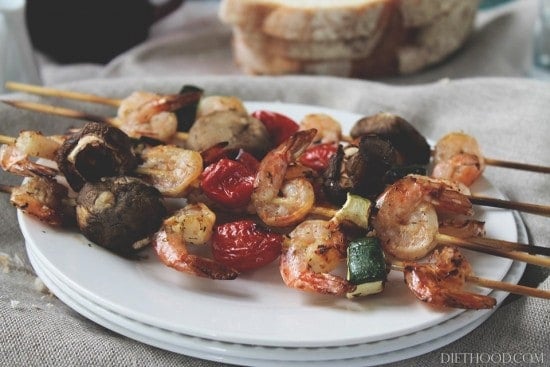 - Grill the skewers for 2-3 minutes per side, or until the shrimp are pink and cooked through. Brush with the reserved marinade during the last minute of grilling.