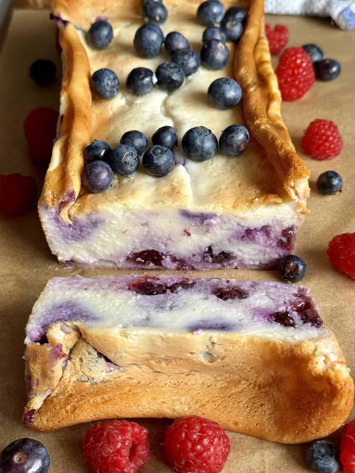 - Allow the cake to cool in the pan for about an hour. Transfer to the refrigerator to set for at least 2 hours. Serve topped with additional berries if desired.