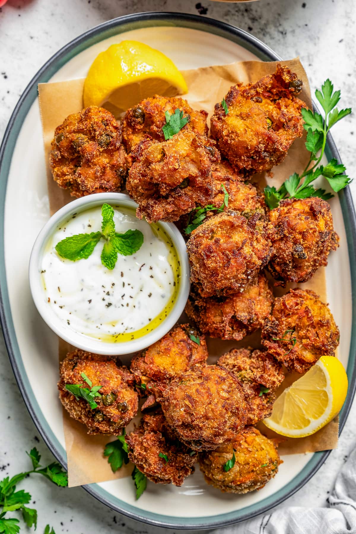- Drain on paper towels. Prepare yogurt sauce by mixing yogurt, garlic, olive oil, and mint.