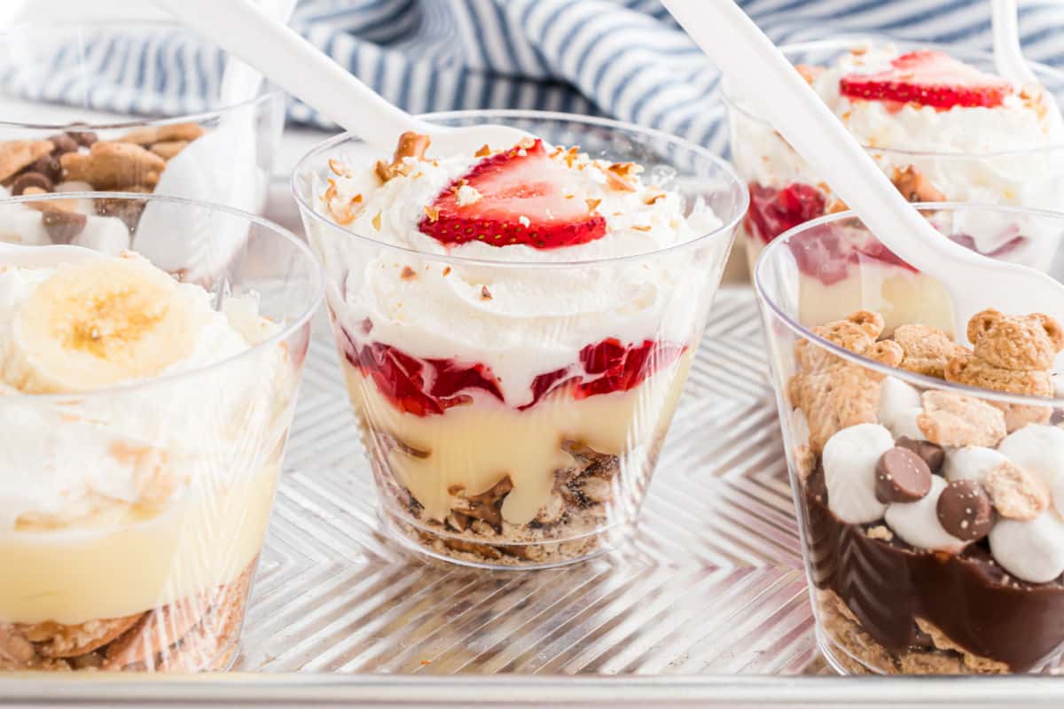 - For the banana pudding bags, open each Nilla Wafer bag, crush a few wafers for garnish, and set upright.