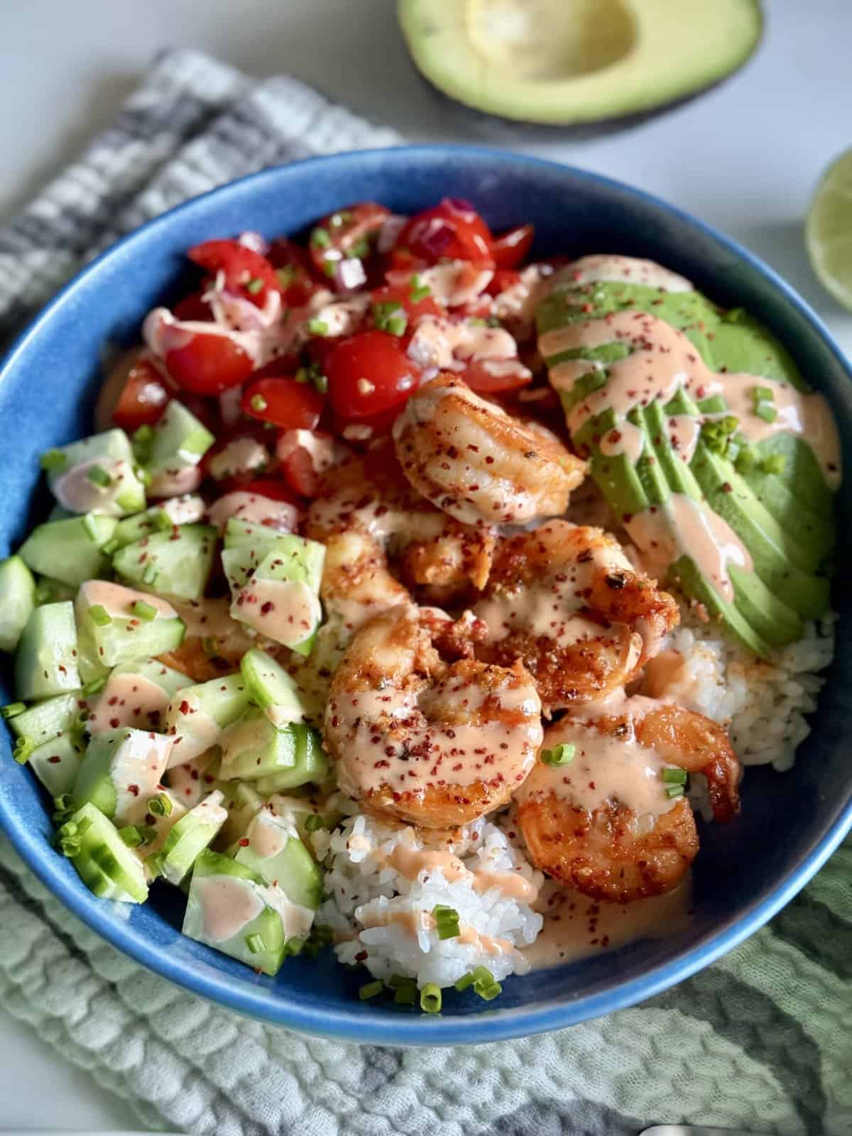 - Divide rice, avocado, tomato salsa, cucumber, and shrimp into bowls. Drizzle with yum yum sauce and enjoy!