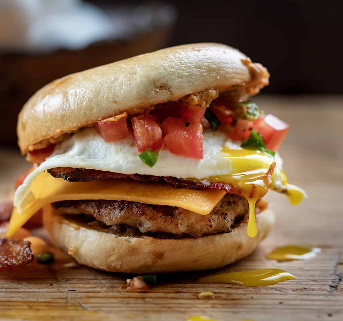 - To the bottom half of a bagel, add one piece of sausage with cheese, 2 slices of bacon, one fried egg, and about a tablespoon of pico. Top with the bagel top and enjoy immediately! Repeat with the remaining bagels.