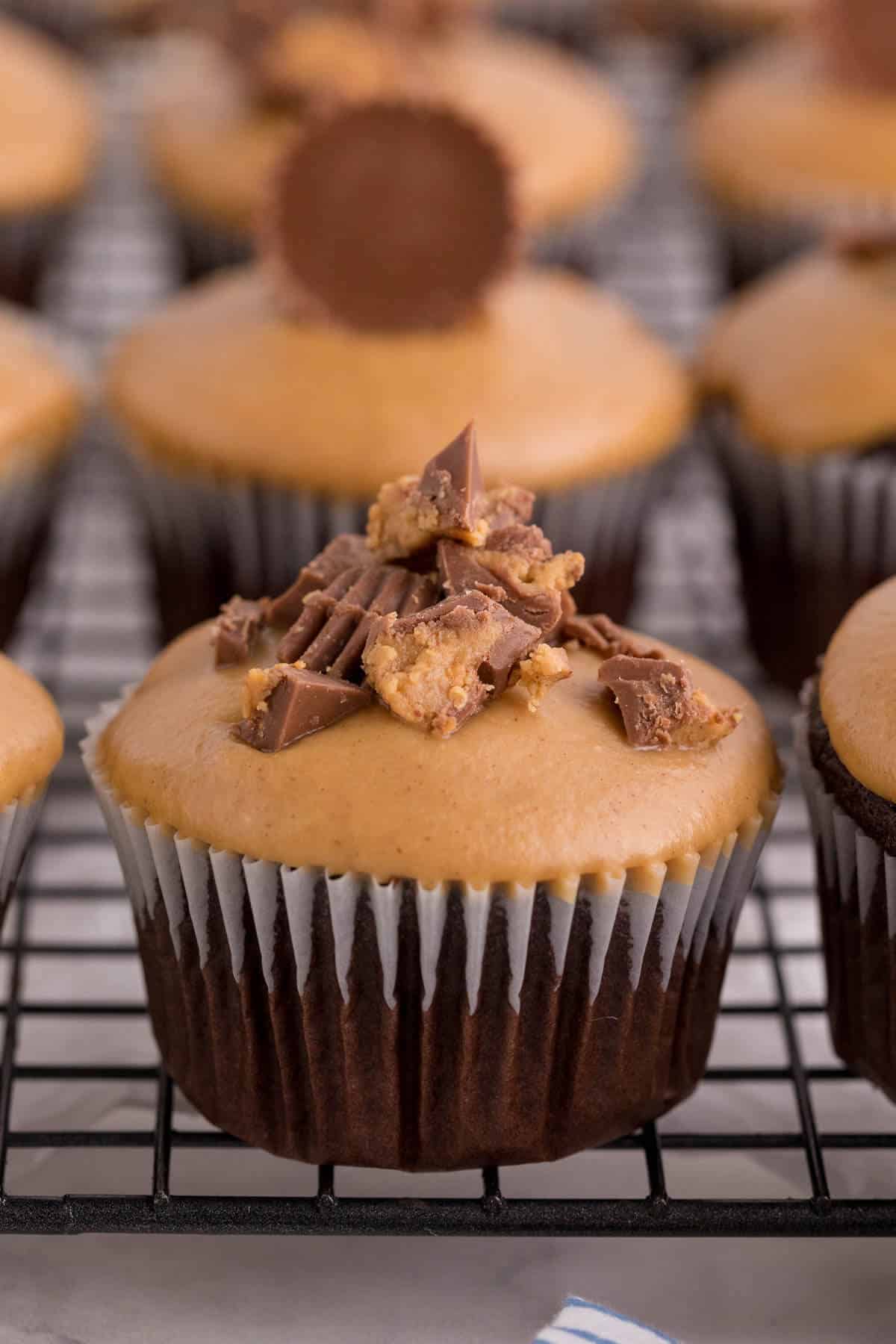 - Spread the glaze over the cooled cupcakes and garnish each with a Reese’s Mini. Let set before serving.