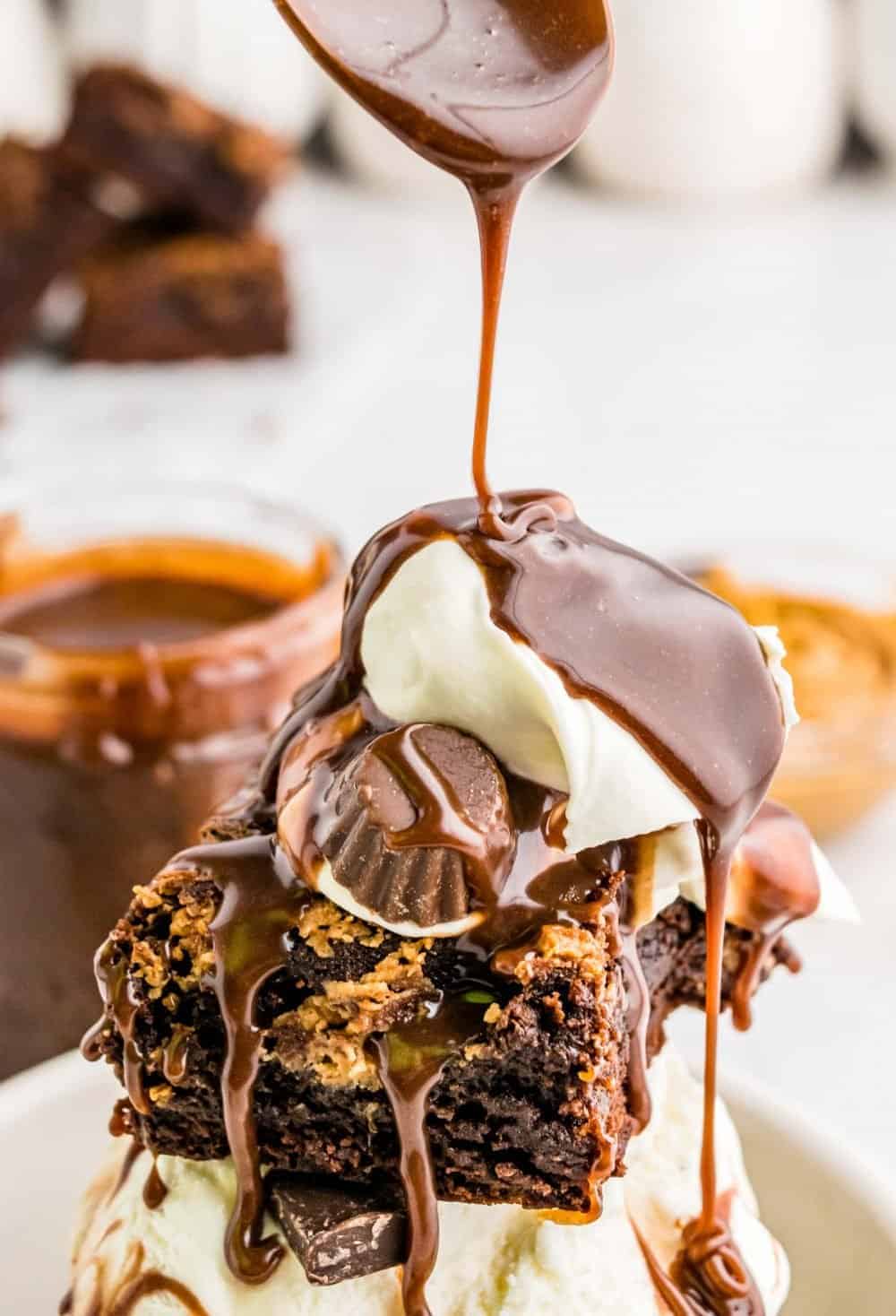 - To assemble the brownie sundae, place a brownie on a plate, top with a scoop of ice cream, drizzle peanut butter hot fudge, and sprinkle chopped Reese's cups.