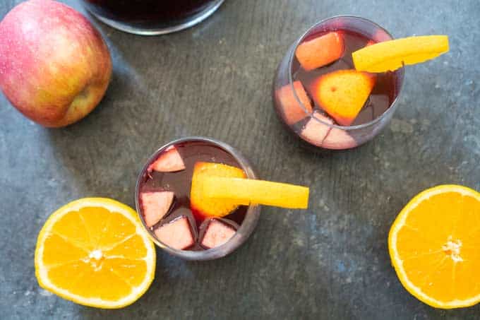 - Chop the apples and oranges into small pieces. Add to a large pitcher.