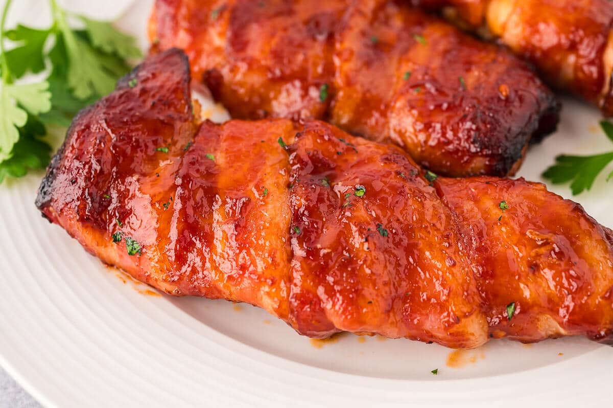 Juicy chicken breasts wrapped in crispy bacon and coated in barbecue sauce. A simple yet delicious recipe perfect for any occasion.
