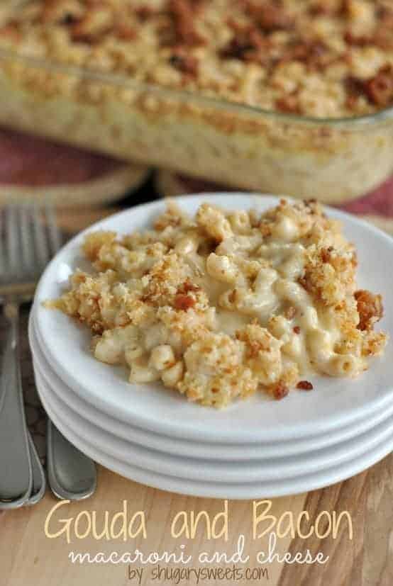 - In the same food processor (no need to wash after shredding cheese), process bread slices to a fine crumb. Mix with melted butter and sprinkle over macaroni. Top with crumbled bacon.