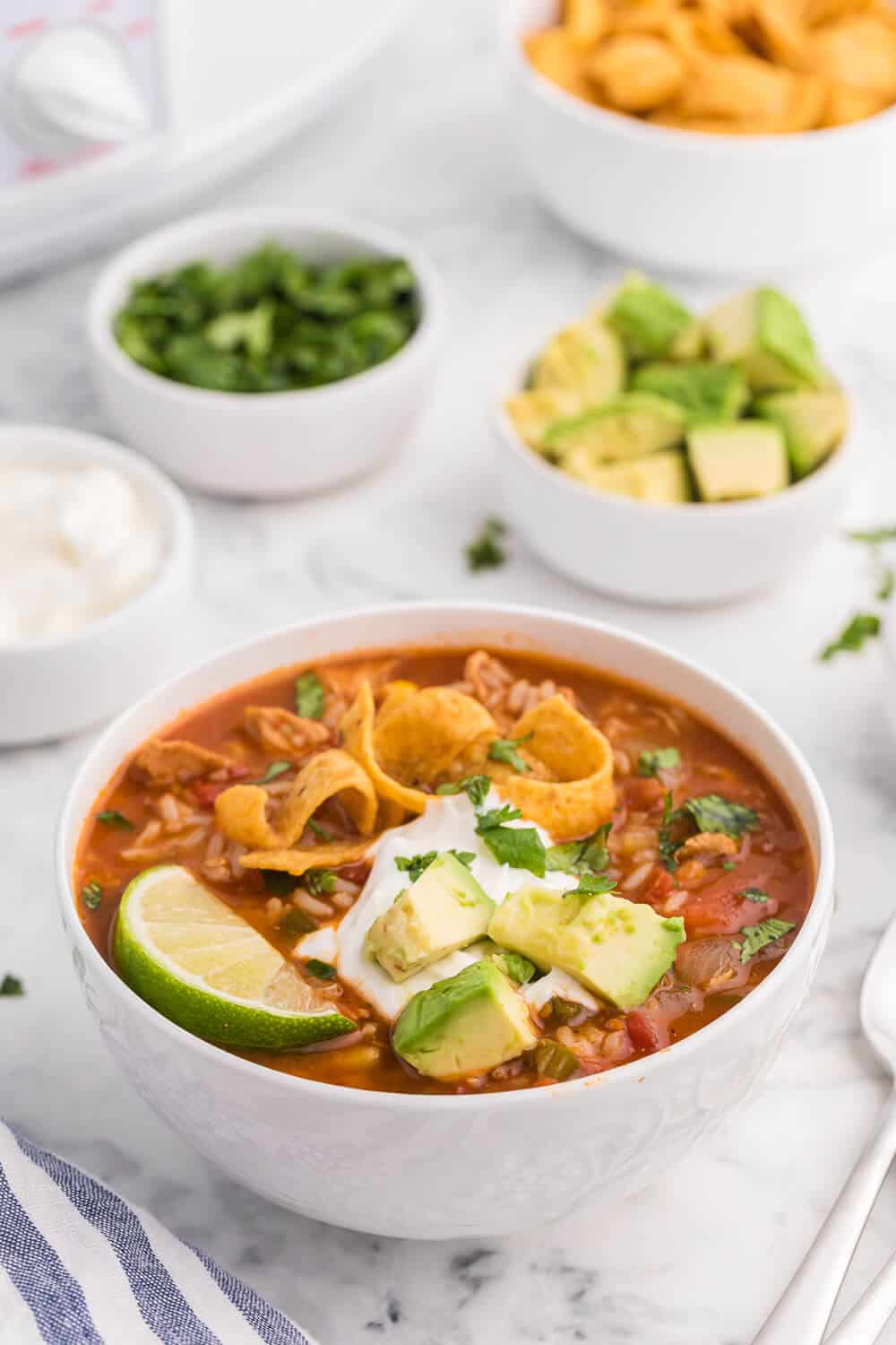 - Ladle into bowls and garnish with chopped avocado, tortilla chips, cilantro, and/or sour cream.