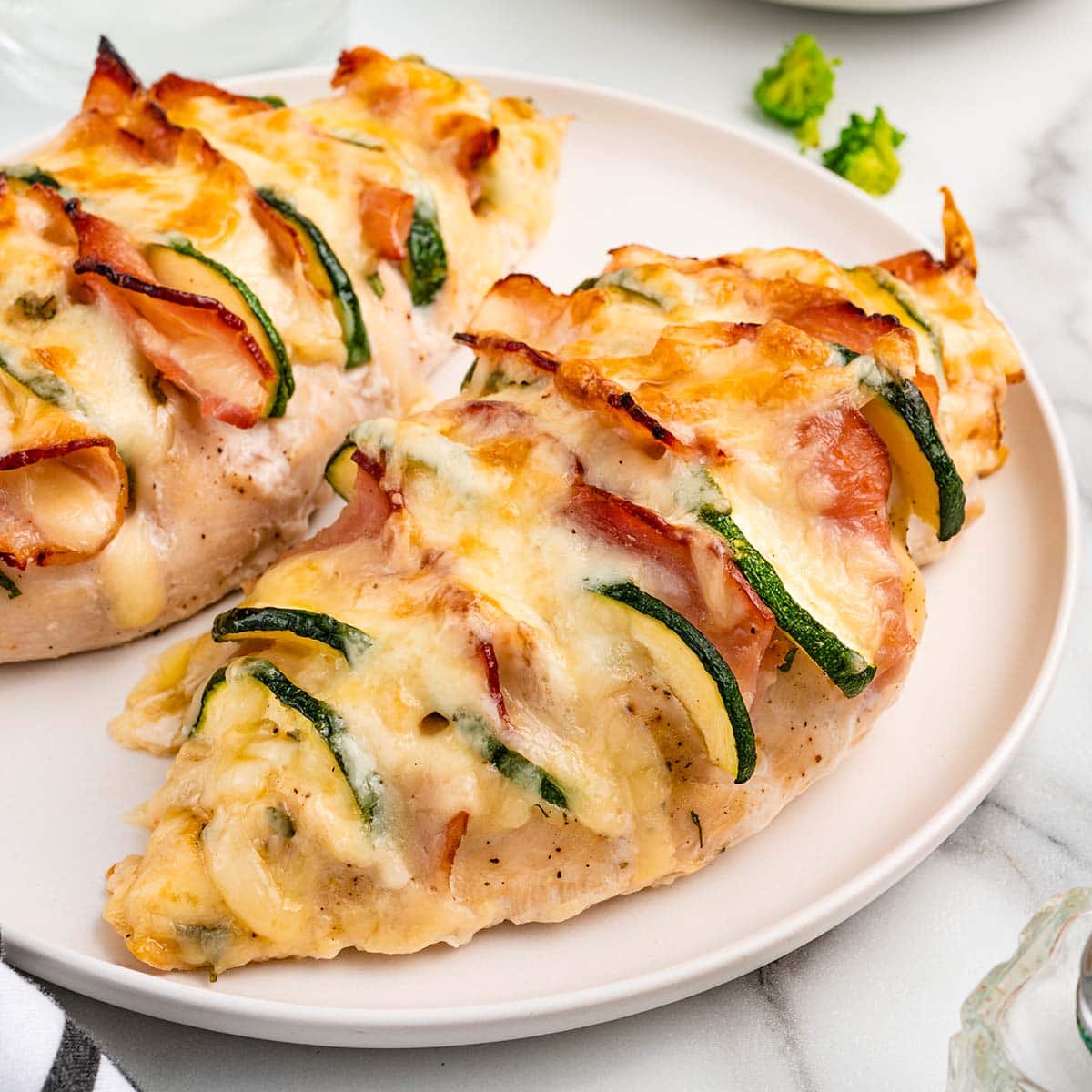 - Gently open each of the slices and insert a piece of Canadian bacon and zucchini slices. Feel free to add more if needed.