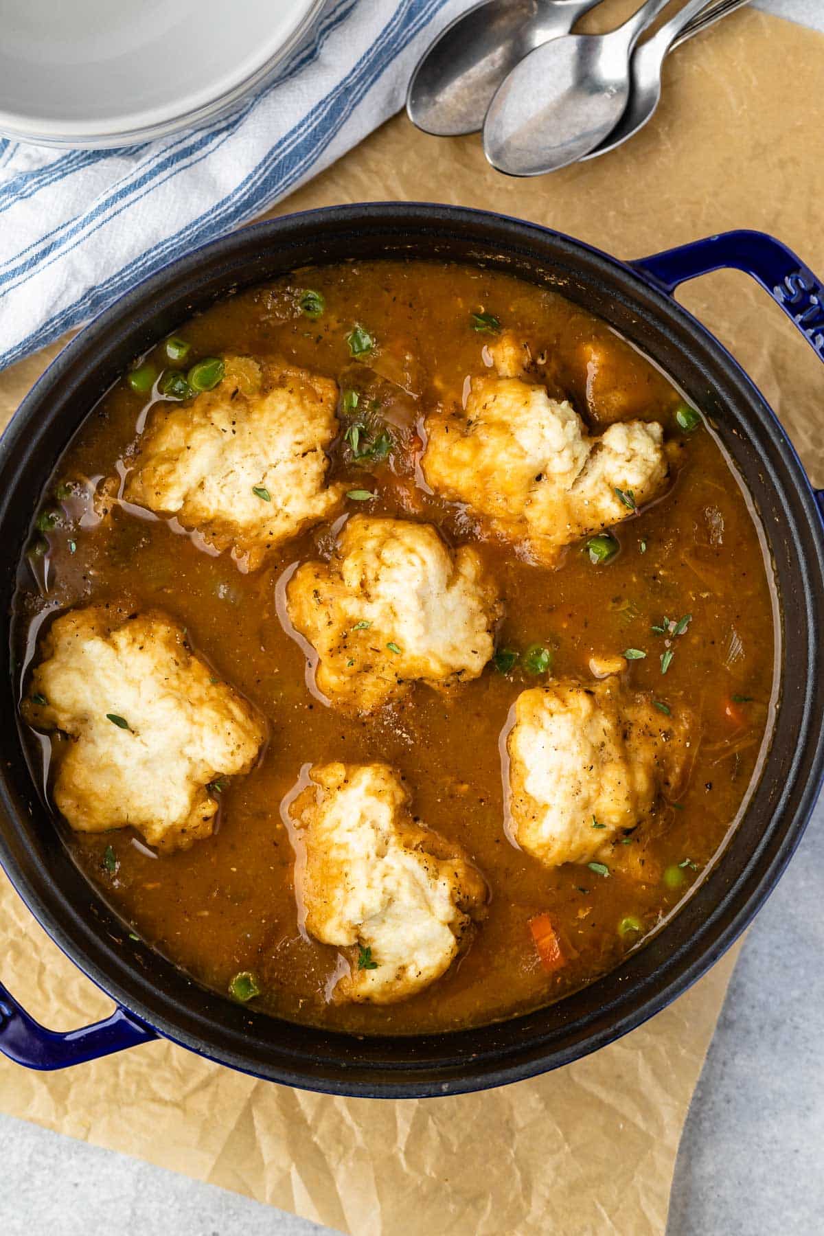 - Drop dumplings into the pot using two spoons. This recipe makes about 6 dumplings, unless you want them smaller or larger.