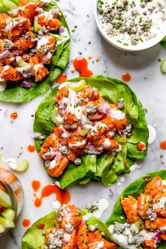 2. Assemble lettuce wraps: Place about 1 tablespoon of cooked shrimp in the center of each lettuce leaf. Top with red onion, celery, and chopped chives. Drizzle with blue cheese or ranch dressing before serving.