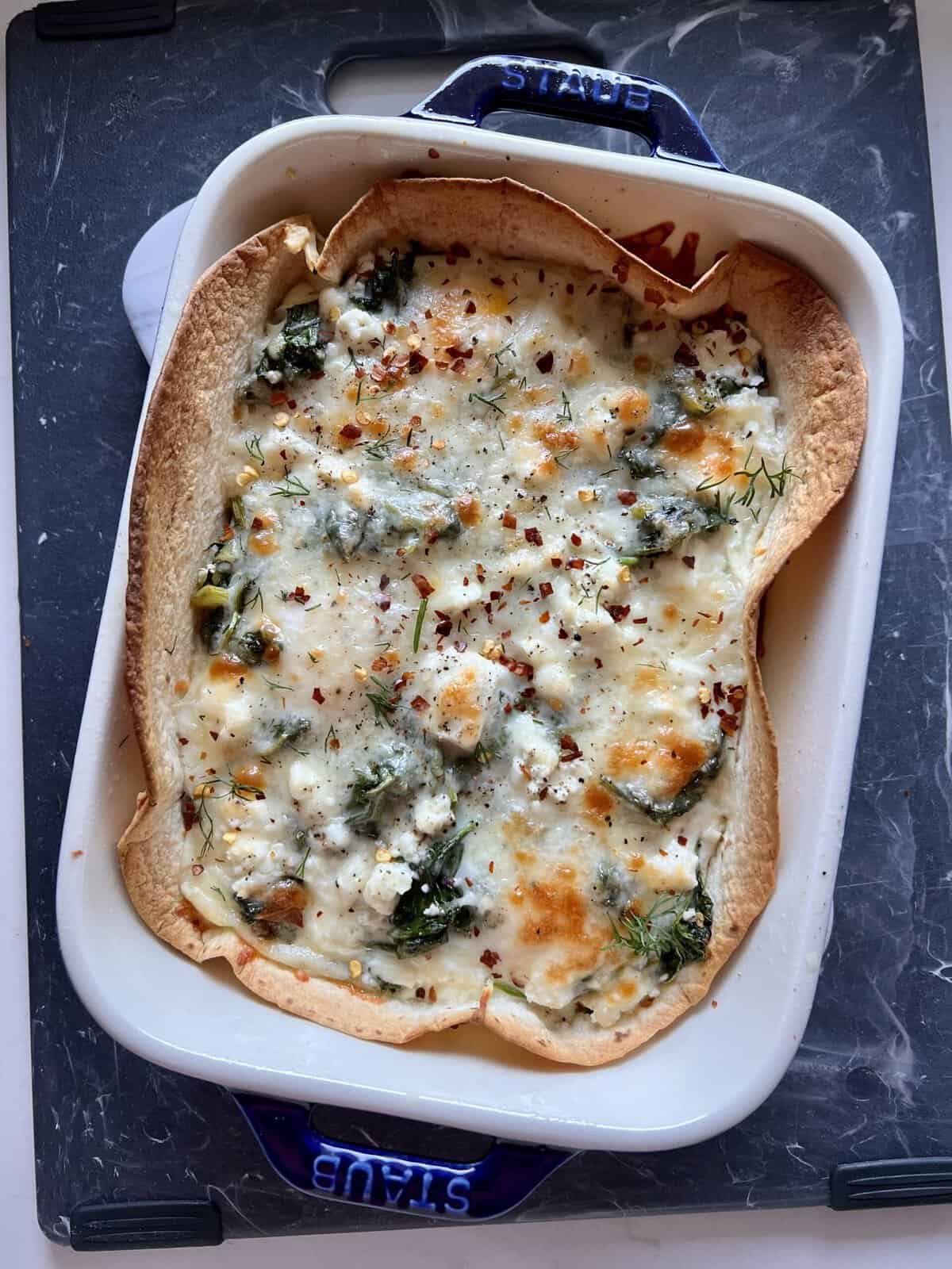 - Place the tortilla into the prepared baking dish, allowing the edges to come up against the sides. Pour in the eggs and season with salt and pepper. Spread the spinach mixture over the eggs, then crumble the feta and mozzarella cheese on top. Bake for 17-20 minutes, or until the eggs are set.