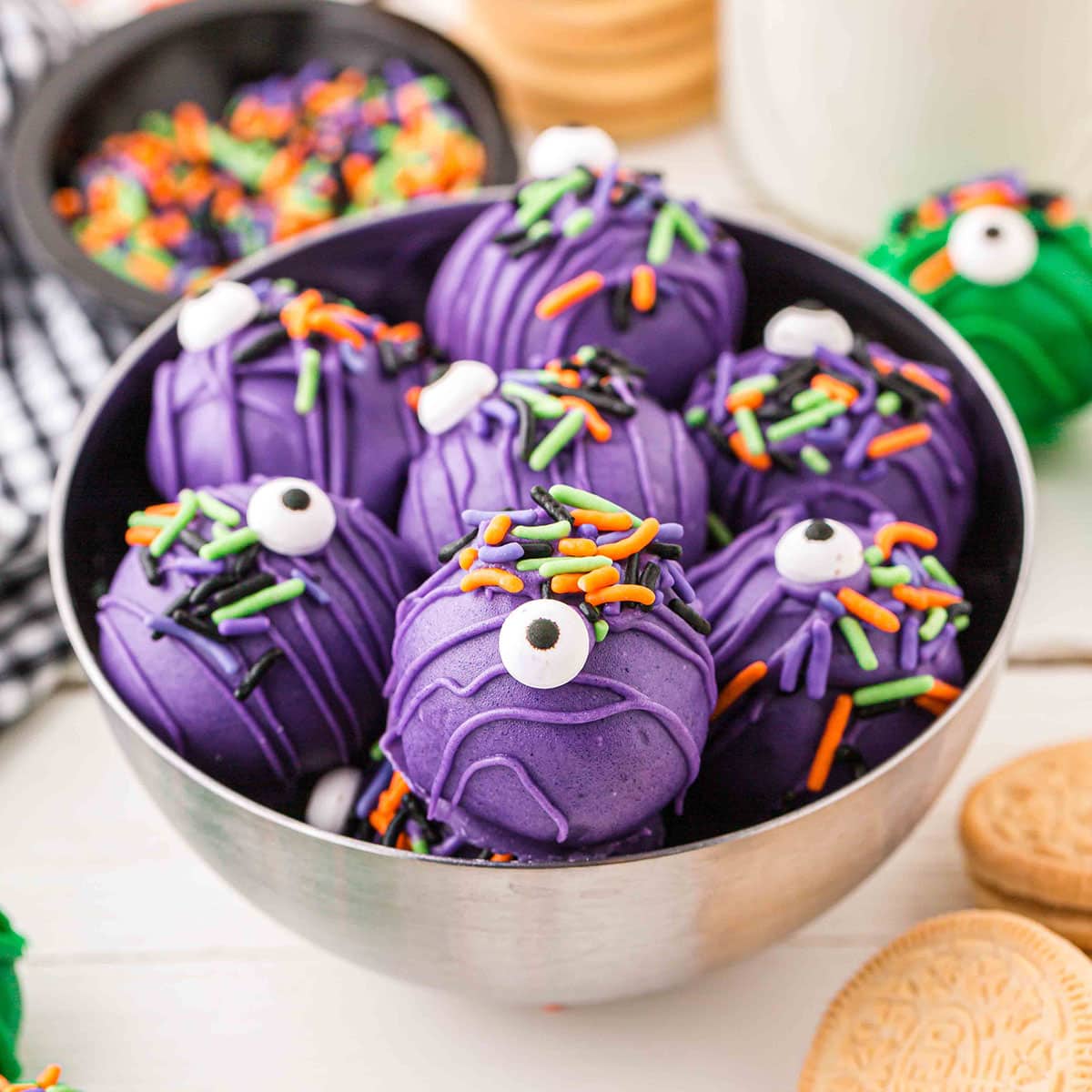 - Press a large eye onto the front of each truffle and sprinkle the top with color-matching sprinkles as "hair."