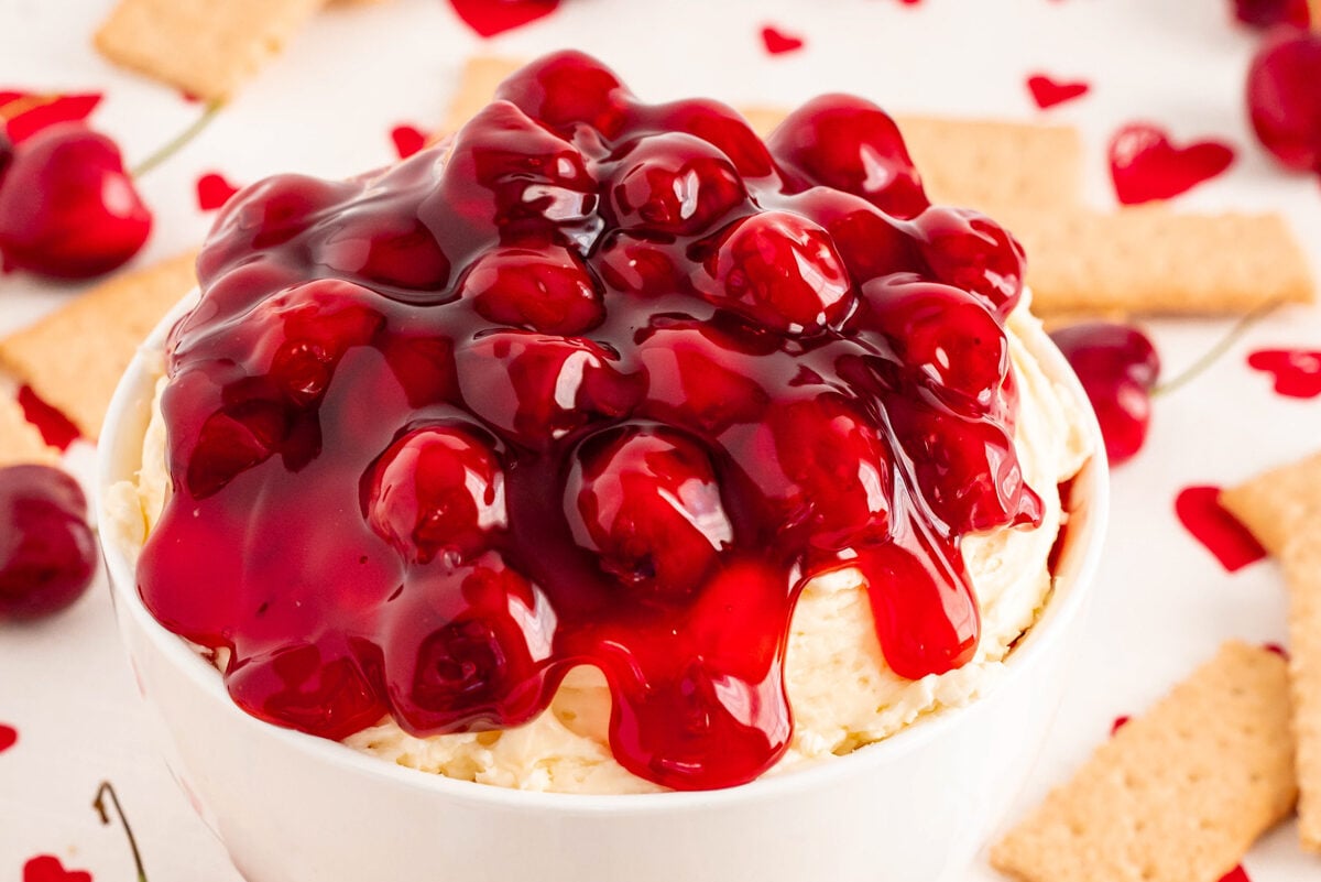 - Transfer the dip to a serving dish. Top with the cherry pie filling and serve immediately with graham crackers, vanilla wafers, or fresh fruit.