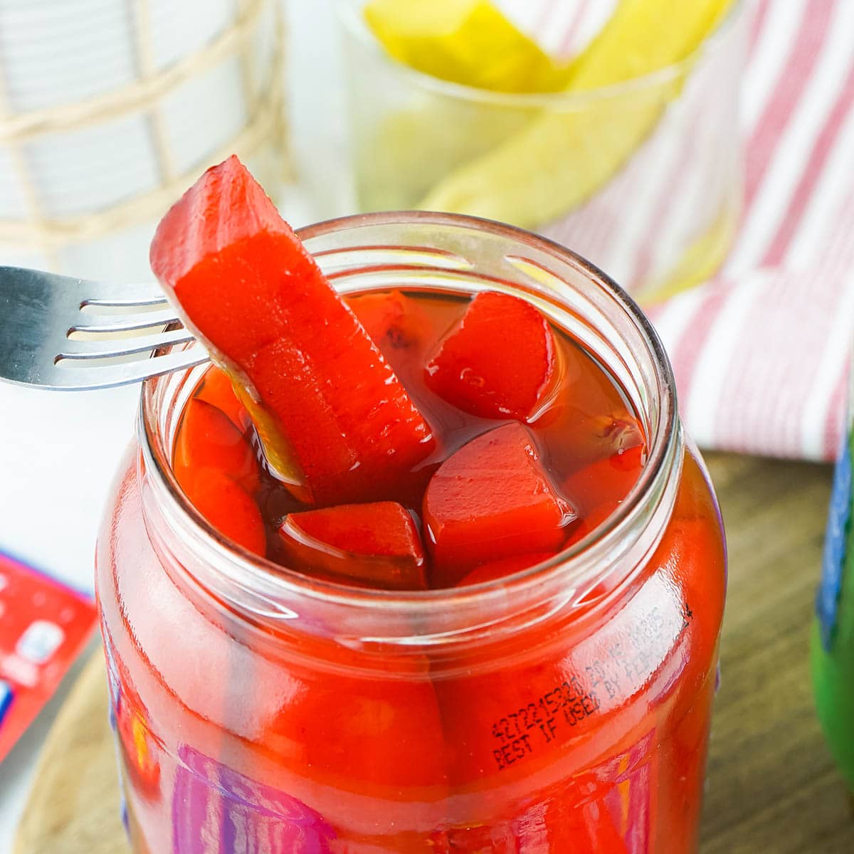 - Open the pickle jar and pour one packet of Kool-Aid inside. Replace the lid and shake well.