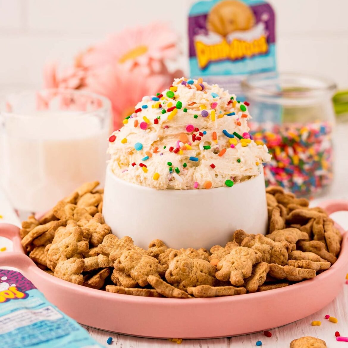- Serve the dip with graham crackers, animal crackers, Teddy Grahams, fruit, or any preferred dippers.
