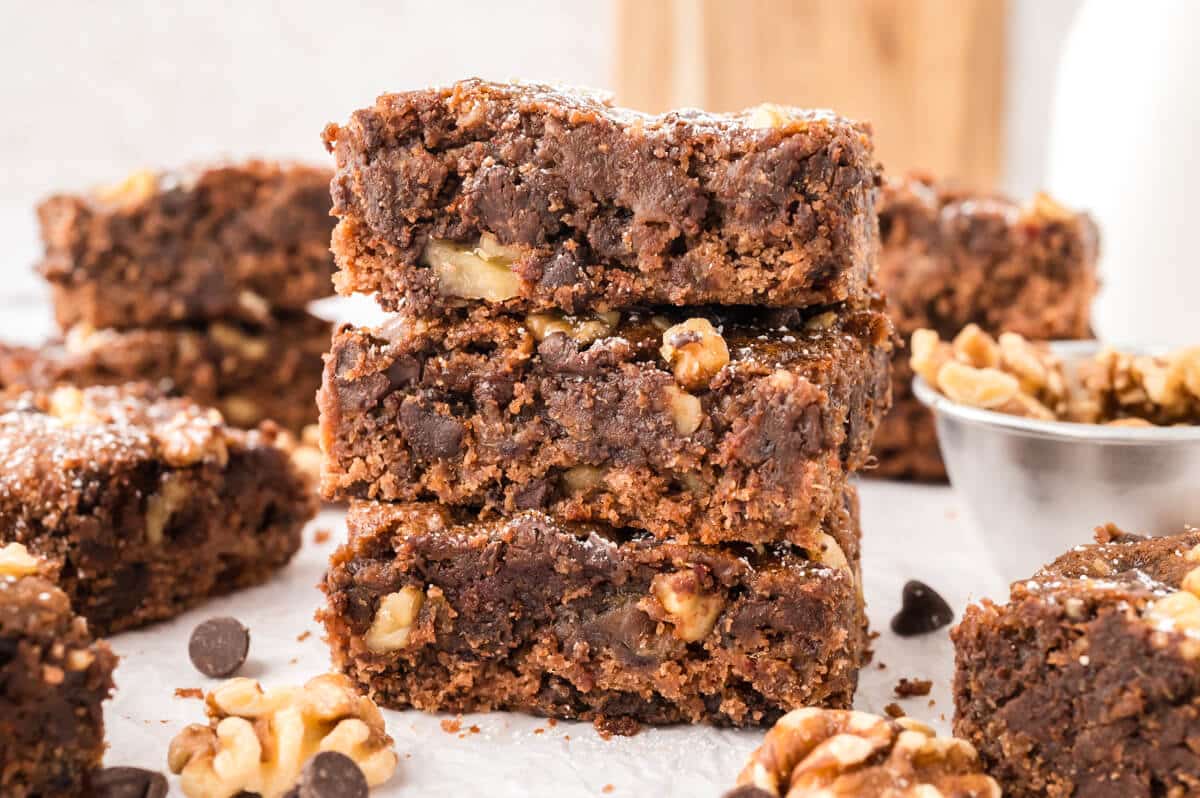 Fudgy Chocolate Surprise Bars made with dates, walnuts, and chocolate chips. A nostalgic dessert with a moist texture and chocolatey flavor.